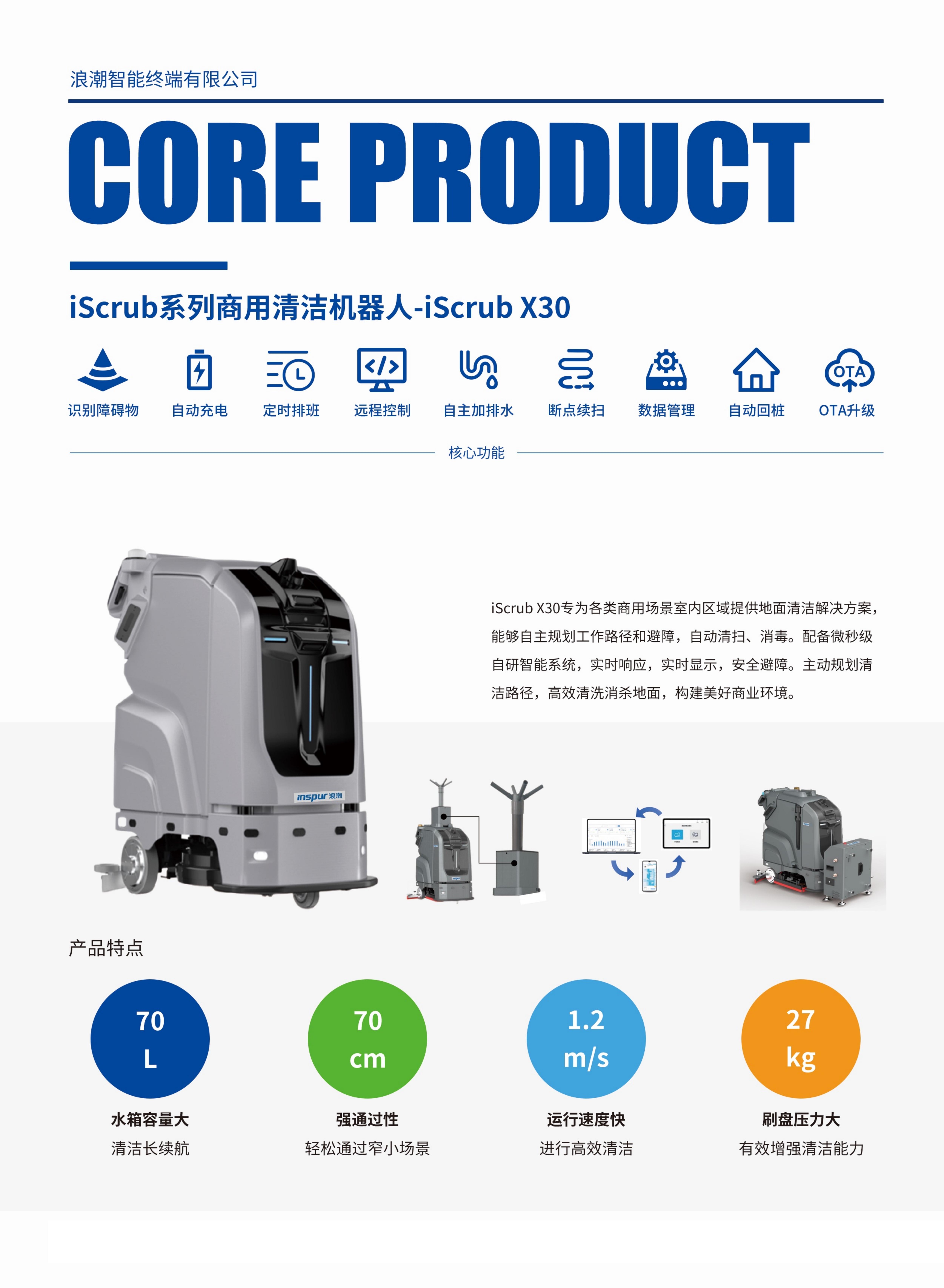 iScrub X30专为各类商用场景室内区域提供地面清洁解决方案,能够自主规划工作路径和避障,自动清扫、消毒。配备微秒级自研智能系统,实时响应,实时显示,安全避障。主动规划清洁路径,高效清洗消杀地面,构建美好商业环境。