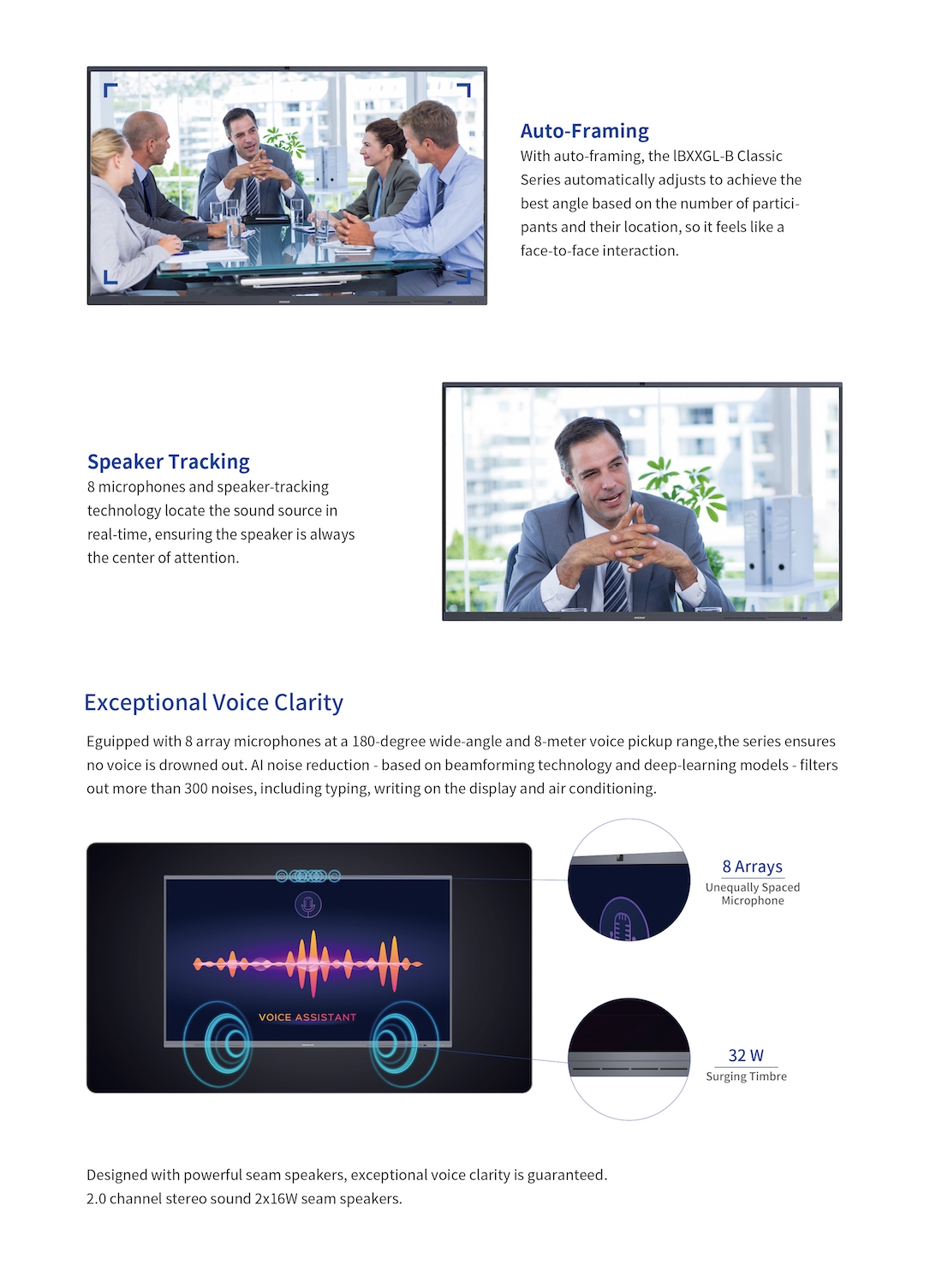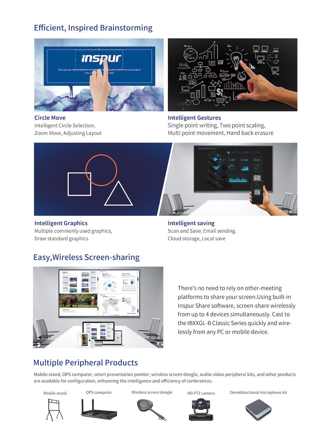 65" 75" 86" It is a new generation of highly efficient office equipment, covering functions needed for writing, presentation, and collaboration in three major conference scenarios. It liberates itself from the complexity of traditional meetings and collaboration boundaries, enabling wireless connections among terminals regardless of time and space.