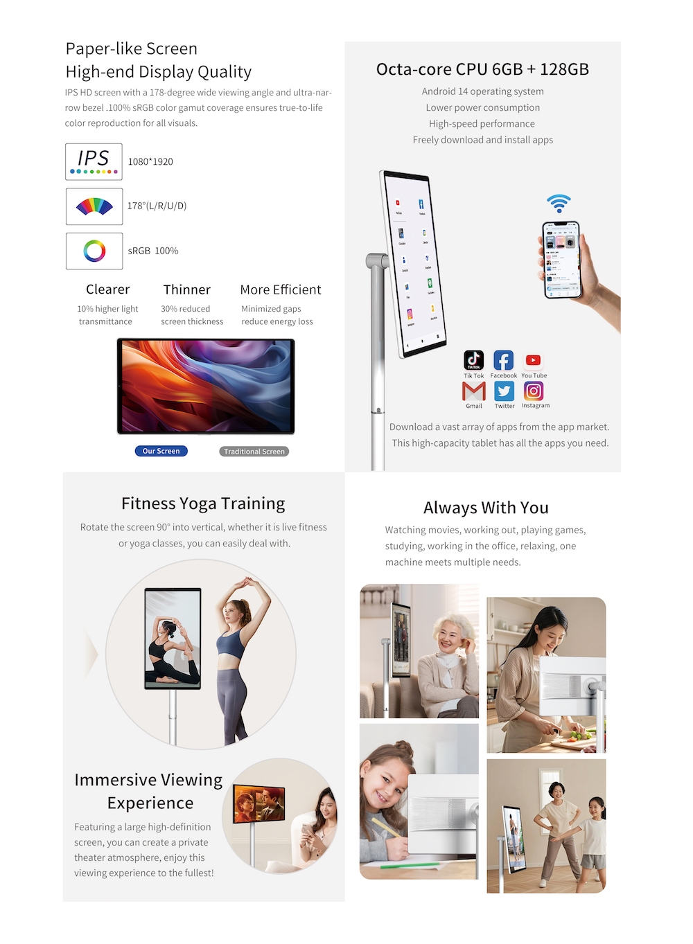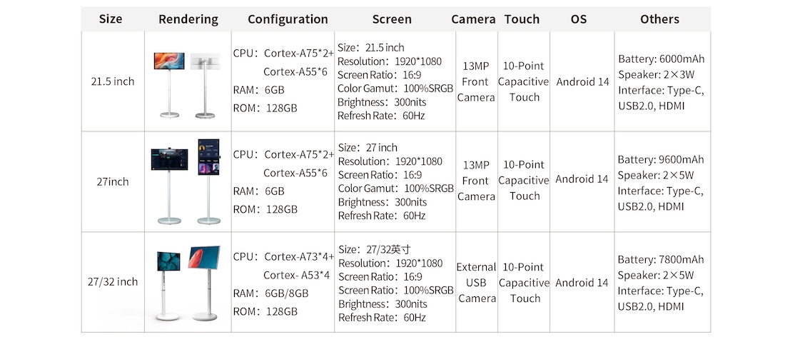 IM22 IM27-SE IM27 IM32 Inspur's mobile smart screen combines features of tablets and TVs, with added benefits of portability, mobility, and small size. Running on the Android platform, it offers excellent app compatibility, seamlessly integrating into the Android ecosystem. The screen size ranging from 21.5 to 32 inches makes it better suited for fitness, binge-watching, karaoke, cooking, meetings, media, and other needs than tablets and smartphones."