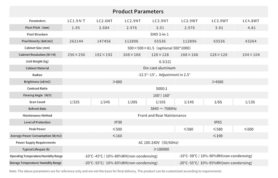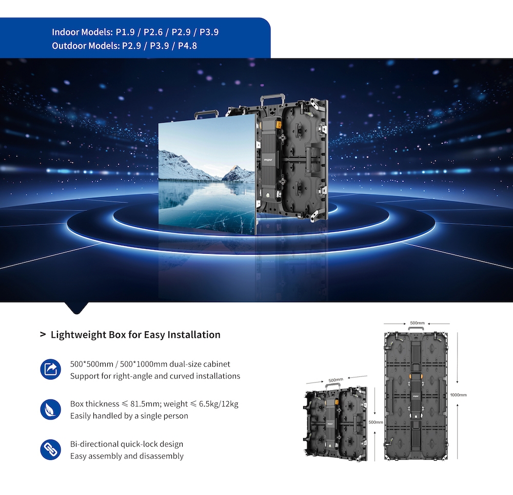Indoor:P1.9 P2.6 P2.9 P3.9 Outdoor:P2.9 P3.9 P4.8 Rental display feature high brightness, high contrast, high refresh rate, and excellent display effects. The product is designed for rapid disassembly and assembly, with lightweight cabinets.