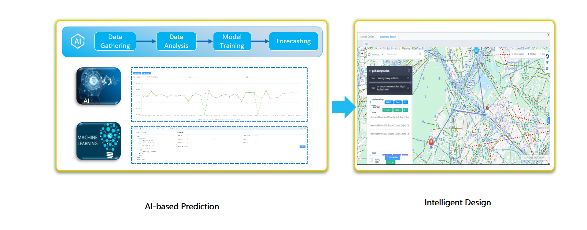 Based on AI capacity prediction and request for new Physical Network Infrastructure, URM supports online network planning & design tool on GIS map, BOM & CAD & budget generation to guide construction and resource data use.