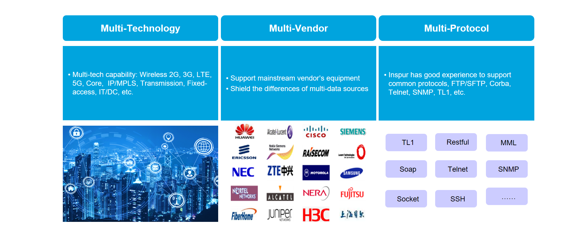 Inspur proposes the Unified Resource Management (URM) solution, offering a comprehensive platform for inside & outside resource, asset lifecycle management, network planning & design to support efficient service fulfilment and assurance. Based on the micro-service architecture of network management, the resource management system functions are decoupled and modularized.