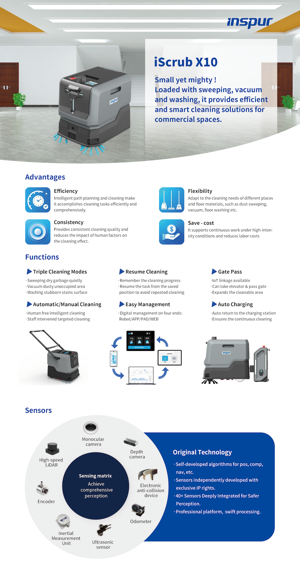 iScrub X10 delivers intelligent, high-efficiency cleaning solutions for commercial spaces. Equipped with an advanced cleaning system, it effectively handles diverse surfaces including hard floors and carpets while ensuring consistent cleaning quality. Utilizing cutting-edge sensors and AI algorithms, it achieves agile obstacle avoidance and intelligent path planning to maximize cleaning efficiency. The system collects real-time operational data and digitally visualizes cleaning results to enable lean management.