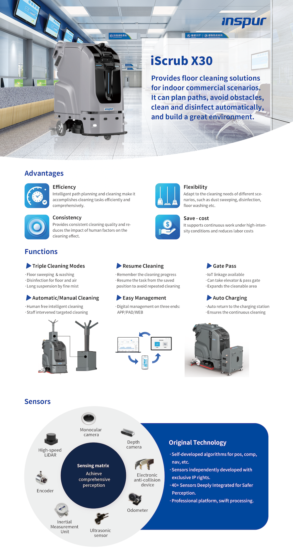 iScrub X30 Autonomous Cleaner delivers comprehensive ground cleaning and disinfection for indoor commercial spaces. Equipped with a microsecond-response proprietary AI system, it autonomously plans optimal paths, avoids obstacles, and performs real-time cleaning and sterilization. The system provides live operational feedback and ensures safe navigation, actively designing efficient cleaning routes to maintain hygienic commercial environments.