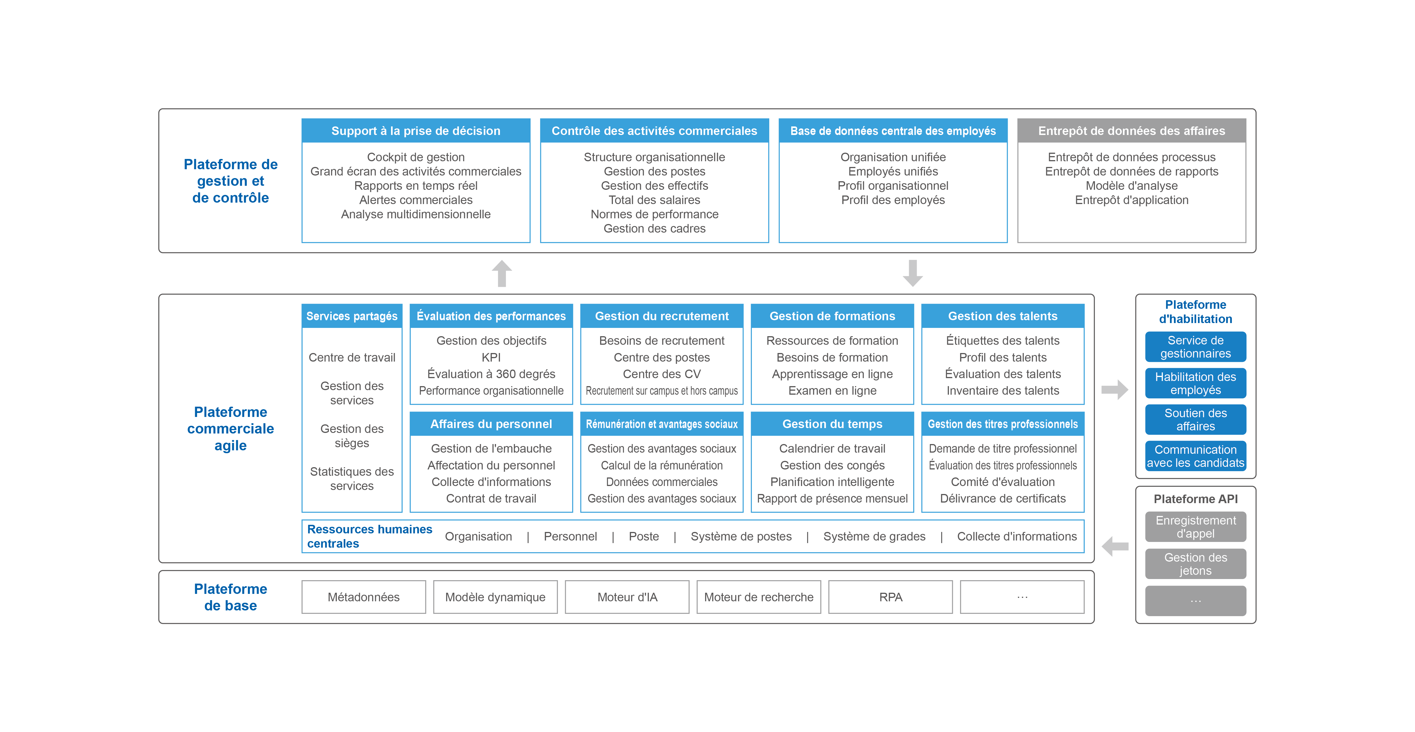 Répond aux besoins d'application à grande échelle des entreprises groupées, avec une conception basée sur des modèles de correspondance poste-personne conformes aux normes internationales, permettant la gestion du cycle de vie complet des employés avec une tra?abilité en temps réel ; l'obtention en temps réel de données provenant d'autres systèmes d'entreprise, pour répondre aux besoins de calcul des salaires et d'évaluation des performances, et pour réaliser l'intégration des affaires et de main-d'?uvre et l'automatisation des processus RH. Il intègre un cadre de partage des ressources humaines, prenant en charge divers modes de partage tels que les trois piliers d'entreprise et le partage de services, le partage d'affaires, etc. Il intègre également un cadre d'inventaire des talents, soutenant ainsi la transition des talents.