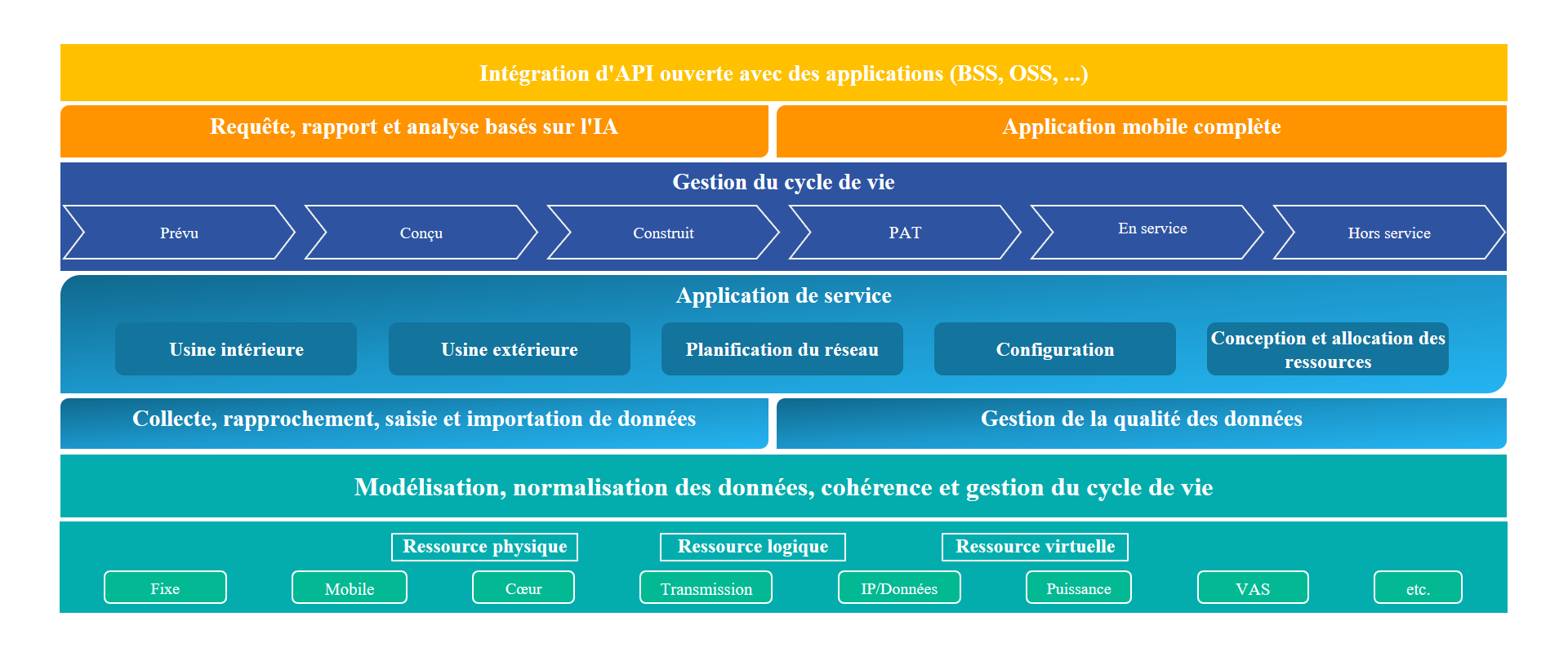 La nouvelle génération de gestion unifiée des ressources (URM) permet non seulement de gérer de manière centralisée différents domaines de réseaux, types de ressources et supports de services télécoms traditionnels et nouveaux, mais elle apporte également une toute nouvelle façon pour exploiter et maintenir les ressources avec l'aide d'un jumeau numérique et de la technologie IA.