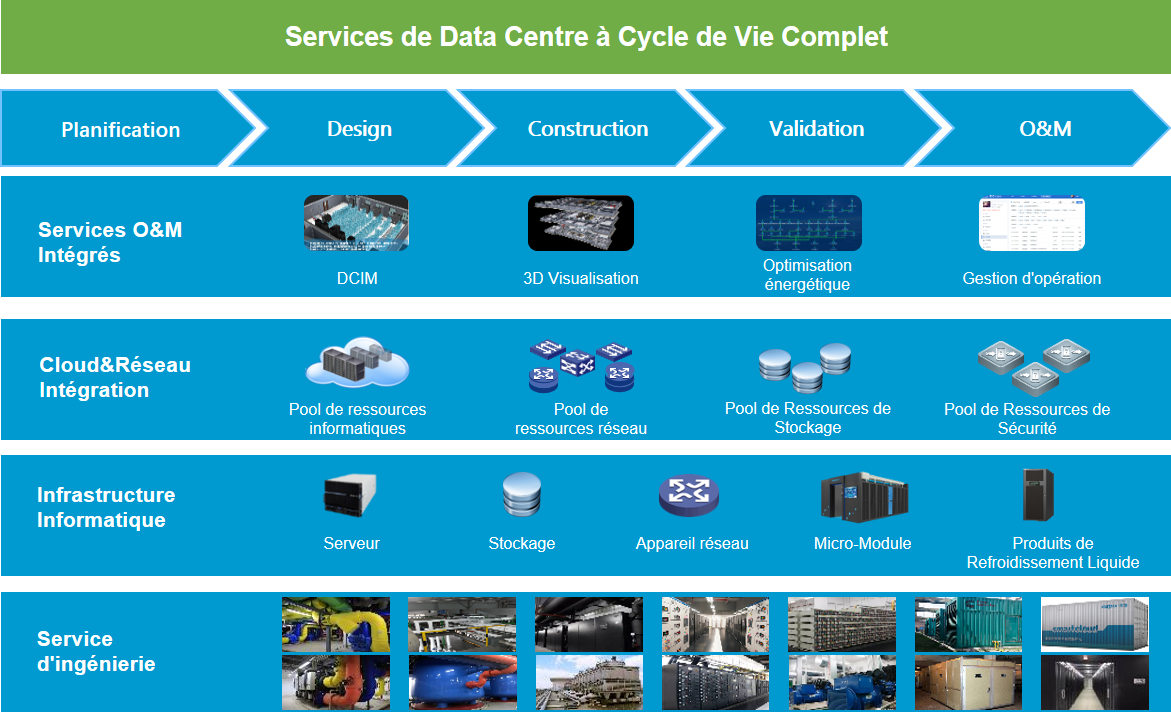 Inspur offre des services d’intégration complets pour les data centres, englobant la consultation, la planification, la conception, la construction et la rénovation, l’intégration, la mise en ?uvre, l’opération et la maintenance, etc. Notre solution complète améliore efficacement la construction et le niveau de service de data centres en garantissant le respect de l’environnement, l’efficacité opérationnelle, la maintenabilité, l’évolutivité ainsi que l’innovation à valeur ajoutée. Notre objectif est aider les infrastructures cloud et les supports numériques pour les clients du gouvernement et de l’industrie.