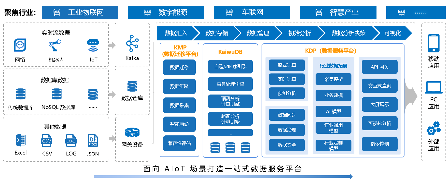 KDP 是以 KaiwuDB 为核心,面向 AIoT 场景打造的一站式数据服务平台,满足工业物联网、数字能源、车联网、智慧产业等行业的核心业务场景下数据采集、处理、计算、分析、应用的综合业务需求,致力于为上述行业领域提供数字化赋能,实现“业务即数据,数据即服务”,助力企业从数据中挖掘更大的商业价值。