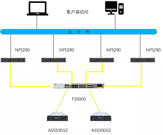 结合现有业务以及后续业务增长量的考虑,浪潮采用双路旗舰机型NF5280以及中端存储AS5300G2来匹配硬件部分的选择。NF5280构建虚拟化集群,通过以太网络直接与客户端相连;浪潮存储AS5300G2形成底层双活,通过光纤交换机与资源池相连。整体方案构成医院单机房双活数据中心虚拟化场景,很大程度上提高了硬件资源的利用率,增强管理效率。数据的存储架构为FC-SAN,通过存储多路径管理软件实现存储通道的负载冗余,提升了业务系统数据存储的可靠性、高效性、安全性。双活的存储架构从根本上解决了单点故障,实现了业务的连续性,同时保证了数据安全。整体架构可以利旧,既帮助用户实现了高容错,高安全,高性能的解决方案,又帮助用户节约了投资成本,满足了客户对新架构的各项需求。