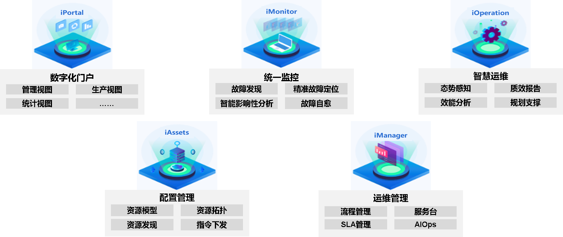 管理范围:基础设施(服务器、网络设备、安全设备、终端、打印机、扫描仪、摄像头)、云平台、虚拟资源、中间件、应用系统及各类网络服务等。
